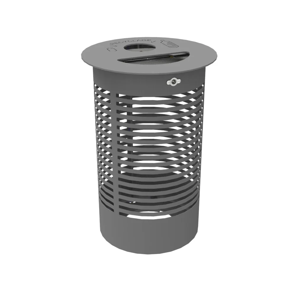 Der Körper des Abfallbehälters Zeitgenössisch weist ein durchbrochenes schlichtes und zeitgemäßes „klassisches“ Motiv auf. Durch seine zwei Innenbehälter und seinem Deckel mit zwei Öffnungen kann dieses Modell innerhalb eines Programms für Abfalltrennung im öffentlichen Bereich eingesetzt werden.