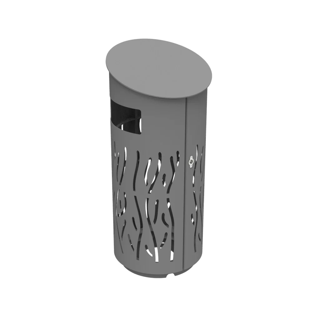 Der Abfallbehälter Zeitgenössisch – Wurzeln zeichnet sich durch seinen schräggestellten Deckel aus. Diese Vorrichtung verhindert das Ablagern von wilden Abfällen. Die breiten Seitenöffnungen dieses Behälters erleichtern das Einführen der Abfälle in seinen Innenraum.