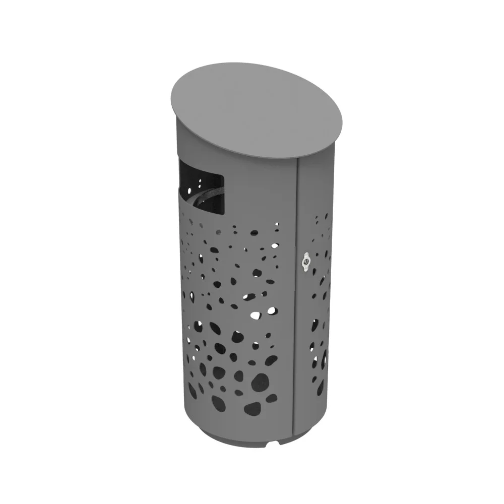 Der Abfallbehälter zeichnet sich durch seinen schräggestellten Deckel aus. Diese Vorrichtung verhindert das Ablagern von wilden Abfällen. Die breiten Öffnungen dieses Behälters erleichtern das Einführen der Abfälle in seinen Innenraum. Der Laserschnitt verleiht dem Behälter einen dynamischen und zeitgemäßen Look. Dieses Modell lässt sich hervorragend mit den Sitzmöbeln Optima Kiesel sowie mit dem Blumentopf Kiesel kombinieren.