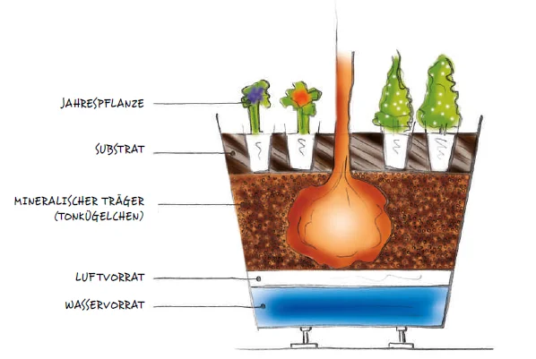 Auf diese Weise verfügt die Pflanze über eine doppelte Wasserreserve: der eine Teil wird im Blumenkasten gespeichert, der andere in den Tonkugeln.