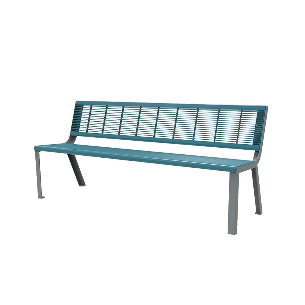 Die Bank kann auch mit einem lasergeschnittenen Stahlsitz, Holzplanken oder Vierkanthölzern geliefert werden. Sie passt hervorragend zu dem quadratischen oder runden Abfallbehälter mit dem gleichen Metallrahmen.
