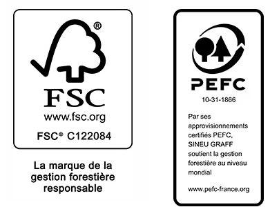 Matériau chaleureux et naturel, le bois, matériau « zéro émission » apporte confort et aspect soigné à nos mobiliers. Proposés en différentes essences (frêne, mélèze ou bois exotique), nos bois sont récoltés exclusivement dans des forêts bien gérées. De premier choix, ils sont labellisés PEFC pour une provenance locale ou sont conformes à la procédure de diligence raisonnée au titre du RBUE (Règlement sur le Bois de l’Union Européenne). Sur demande, nos bois exotiques sont également disponibles avec le label FSC®.