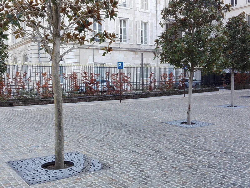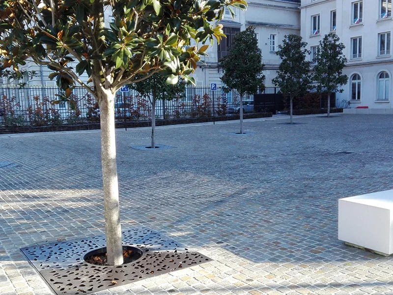 La grille d’arbre Galets s’inspire de la nature. Les découpes sont de taille et de forme différentes et positionnées de façon aléatoire.
