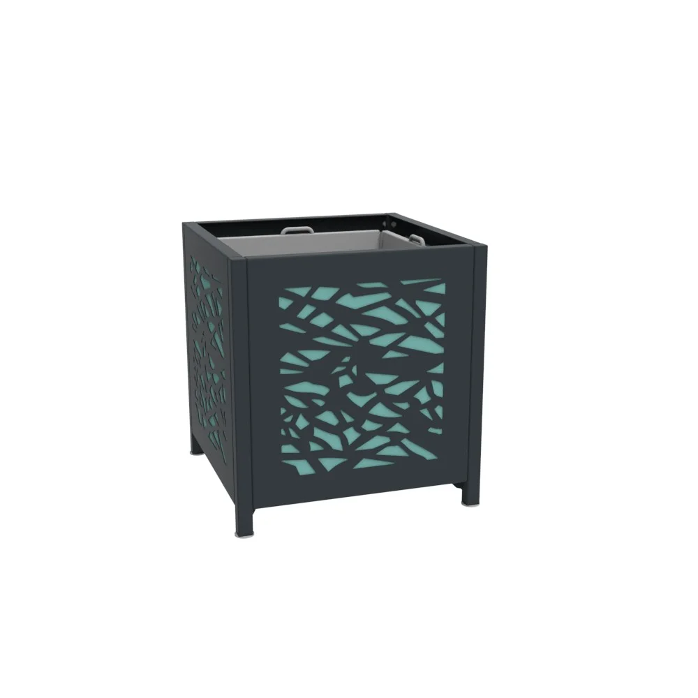 La jardinière Optima Graphique est en acier peint, orné d’un motif aléatoire très stylisé, découpé dans la matière.