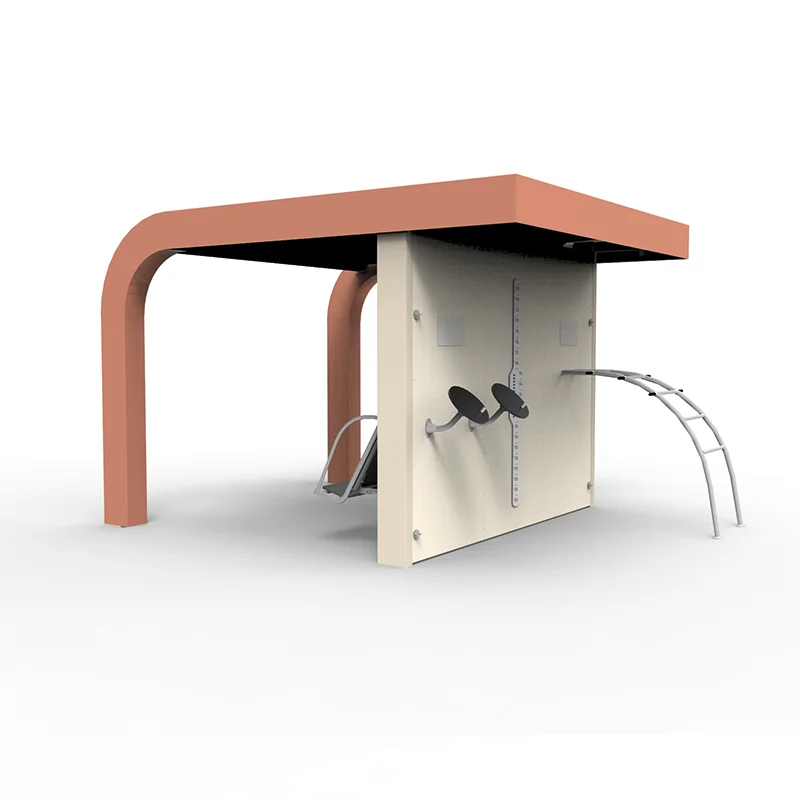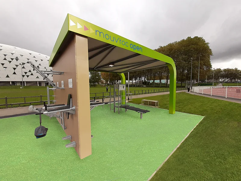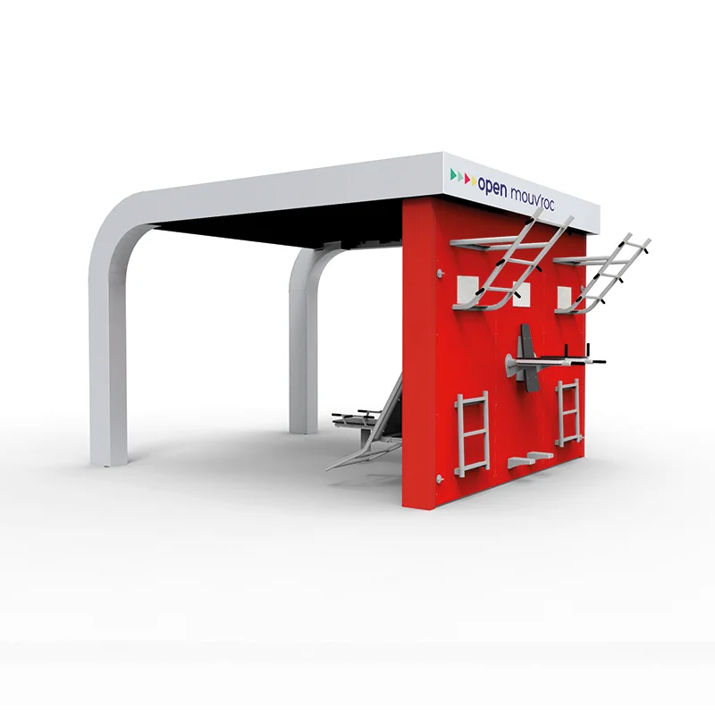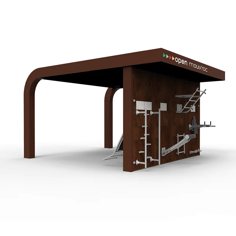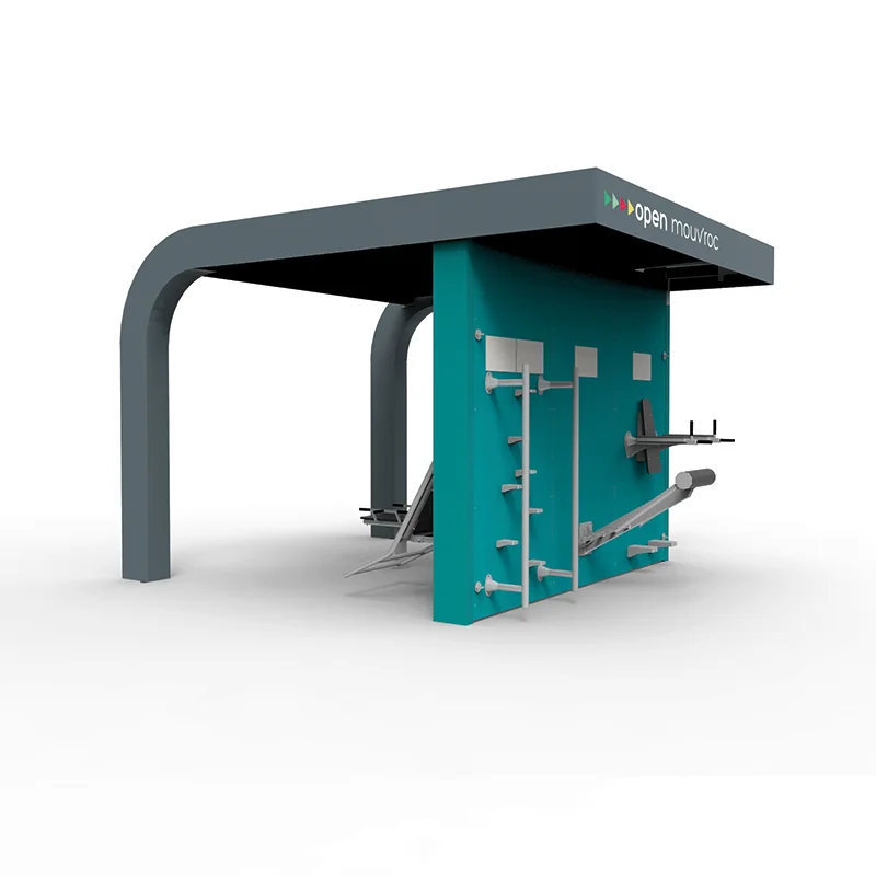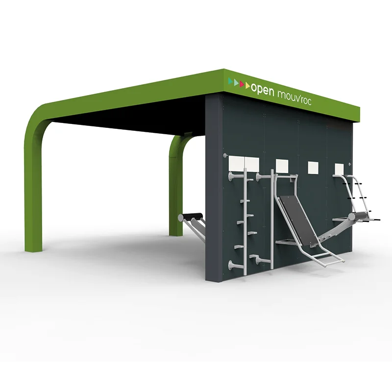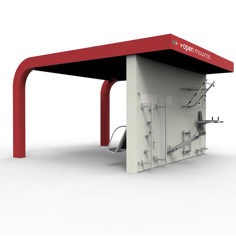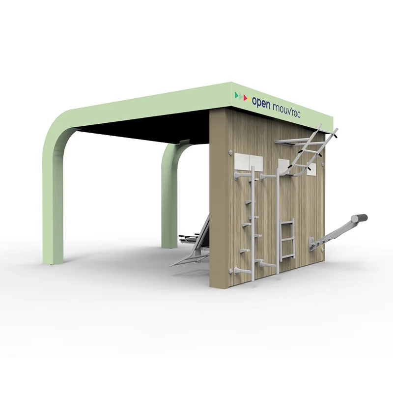 Chaque modèle d'Open Mouv'roc® dispose d'un certain nombre d'agrès en fonction de sa taille. Un panneau d'exercices est affiché pour pouvoir pratiquer en toute liberté. Un QR CODE présent sur chaque panneau d'exercice permet d'accéder à des exercices complémentaires.